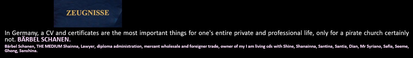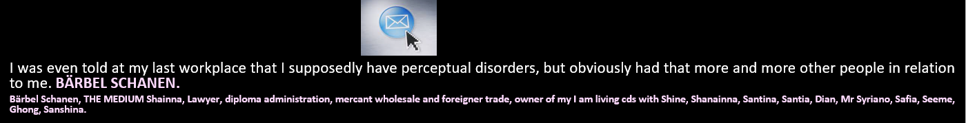 Bärbel Schanen, DAS MEDIUM, Volljuristin, Dipl. Verww. (FH), Kauffrau im Gross- und Aussenhandel, Eigentümerin meiner I am living cds mit Shine, Shanainna, Santia, Santina, Dian, Mr. Syriano. Safia, Seeme, Ghong, Sanshina.